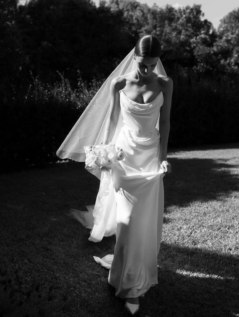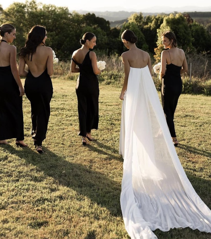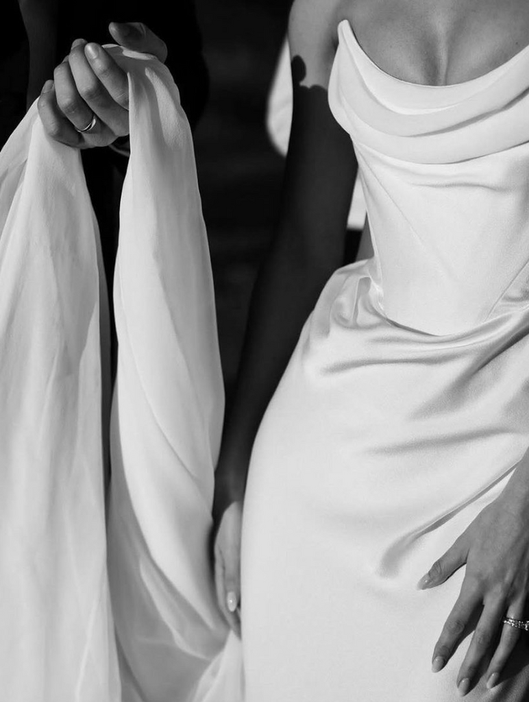 This dress is available in crepe satin with a georgette cape certified as organic. The crepe satin comprises 73% acetate and 27% viscose, both certified by the Forest Stewardship Council (FSC). This guarantees wood fibres used in fabrics we source come from FSC™ certified forests that have been audited by a third-party on their environmental, social and economic standards. We also partner with Canopy to support their goal of protecting the world’s forests by working to eliminate Ancient and Endangered Forests from wood fibre sourcing for fabrics and packaging.