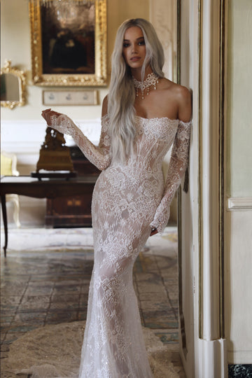 The mermaid silhouette is perfectly tailored to accentuate the figure, while the butterfly-shaped neckline frames the décolletage in soft, romantic detail. The gown features detachable lace sleeves for two looks in one: a timeless ceremony style that transitions seamlessly to a sleek, modern reception moment.