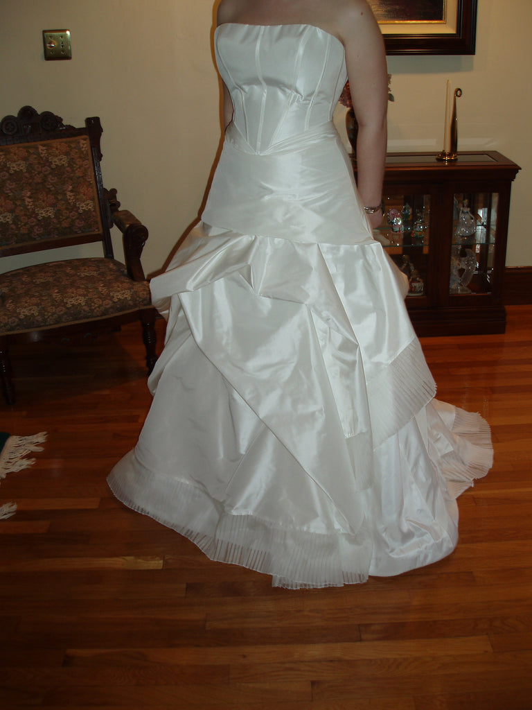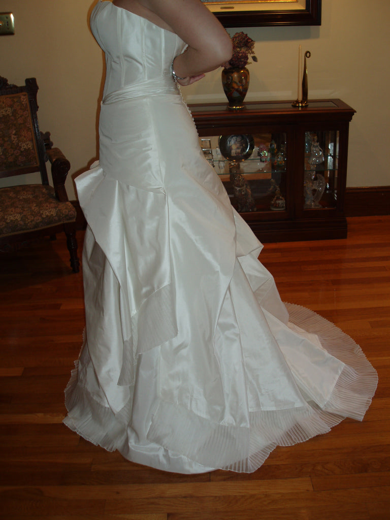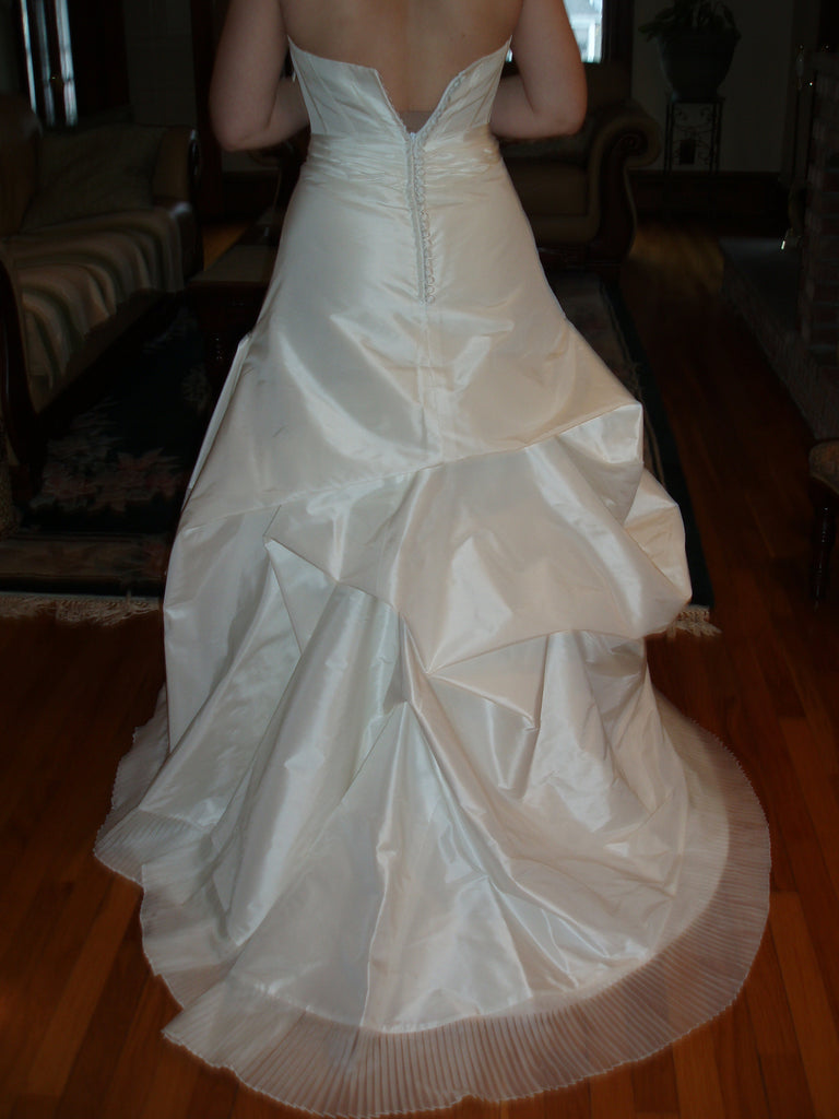 This is your chance to own a designer gown at a bargain price! I loved this dress when I bought it but unfortunately gained some weight since that time. As you can see in the photos, I could not zip it up fully. I had two dresses in my possession and the other one fit, so this one has to go. The retail value on this gown is $3,200, plus the custom addition of extra buttons along the zipper, which was an extra $200. The total retail on this dress is $3,400! This dress is 100% silk taffeta, and a luminous, pearly shade of white (the nature of the silk it's made of). It comes with a built-in crinoline, and all photos are taken of the dress as-is (no additional petticoat used, although it could be added if more fluff is desired). It has not been taken out of the bag except to take photos to post here (taken in two different rooms, but on one occasion). It is brand new, and has the designer's tag on the inside (no hang tags, as it was custom). It is currently being stored in a smoke free, pet free, and dust free home. I am 5'5" and in the photos I am wearing 3.5" heels, so someone up to probably 5'10"+ could wear this if they wore flat shoes (as you can see, it is quite long on me).