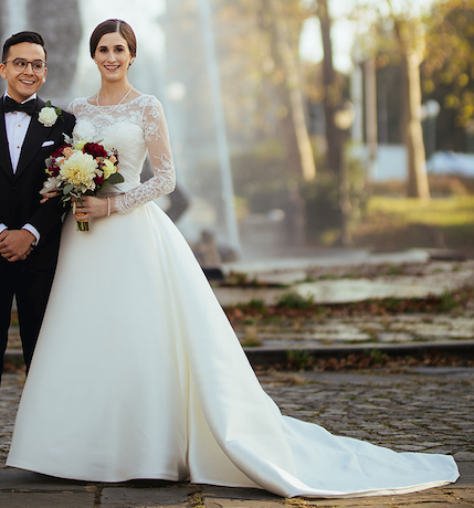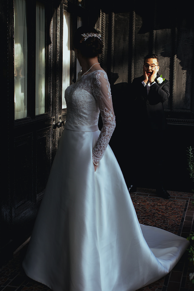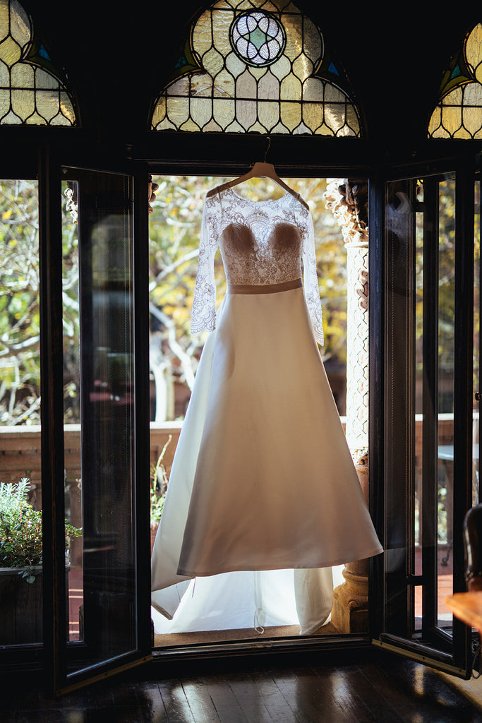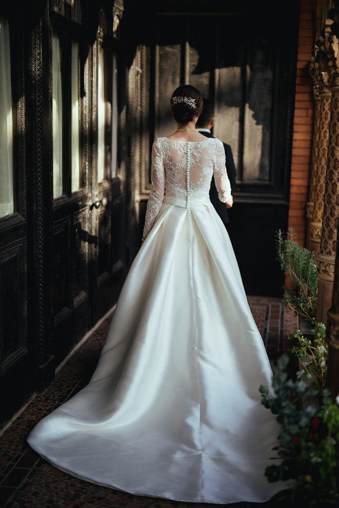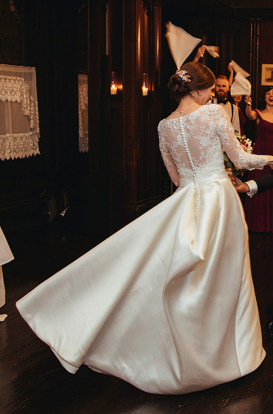 This dress was purchased in December 2017 and worn in November 2019. I loved everything about this dress--the functional buttons all the way down the back and at the wrists, the gorgeous illusion neckline covering a sweetheart bodice, the delicate lace sleeves, the tulip-petal-shaped mikado skirt with a long, long train. It has POCKETS!!
