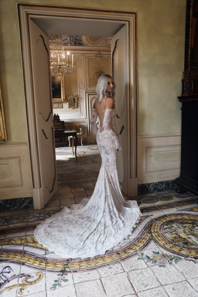 The mermaid silhouette is perfectly tailored to accentuate the figure, while the butterfly-shaped neckline frames the décolletage in soft, romantic detail. The gown features detachable lace sleeves for two looks in one: a timeless ceremony style that transitions seamlessly to a sleek, modern reception moment.