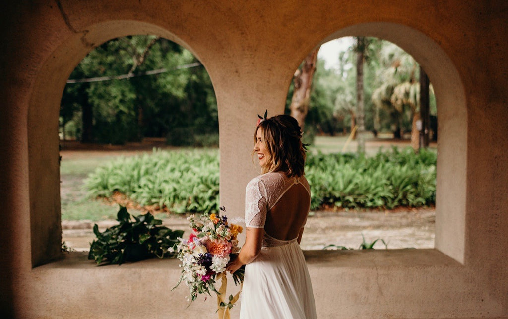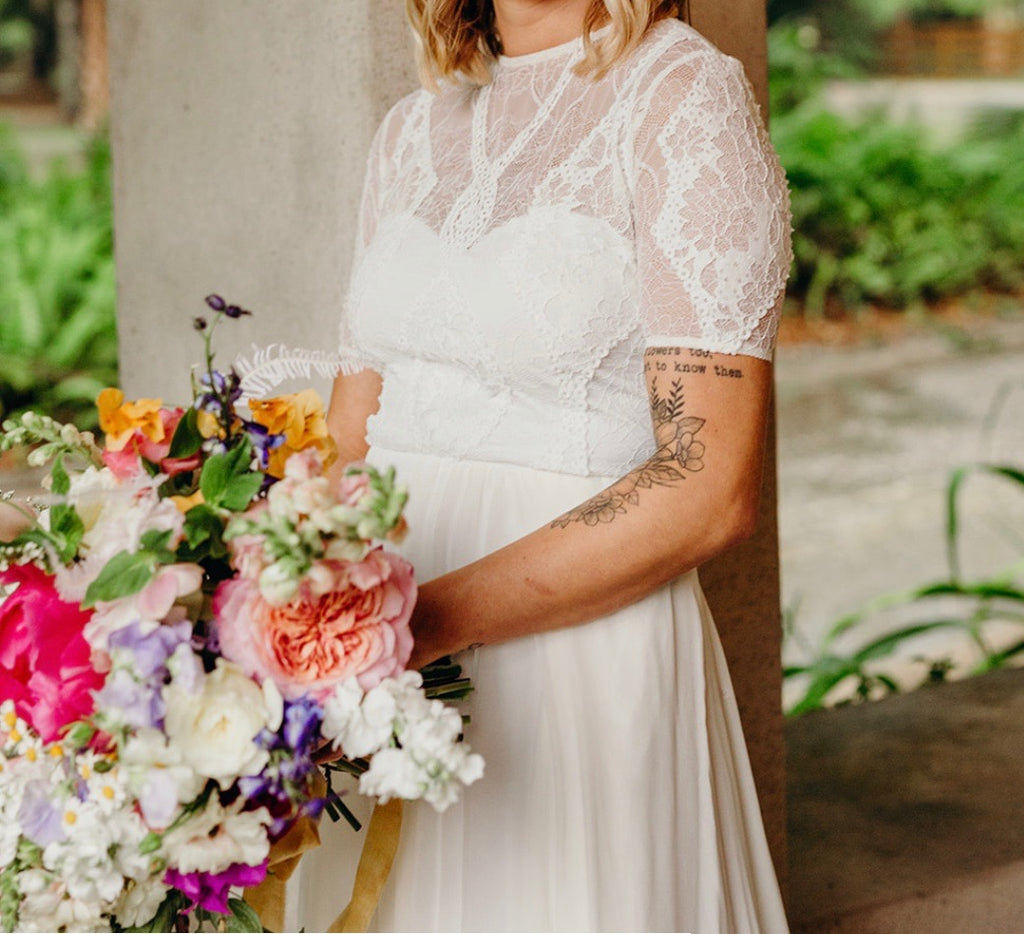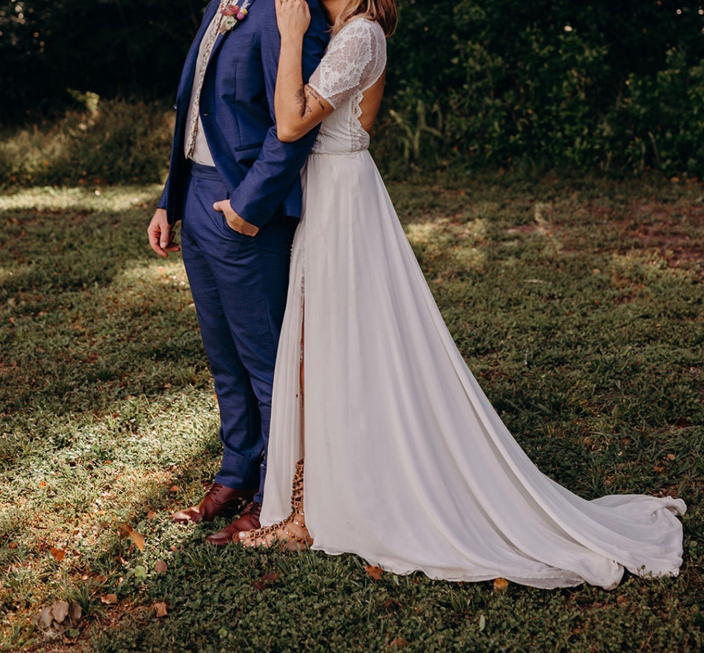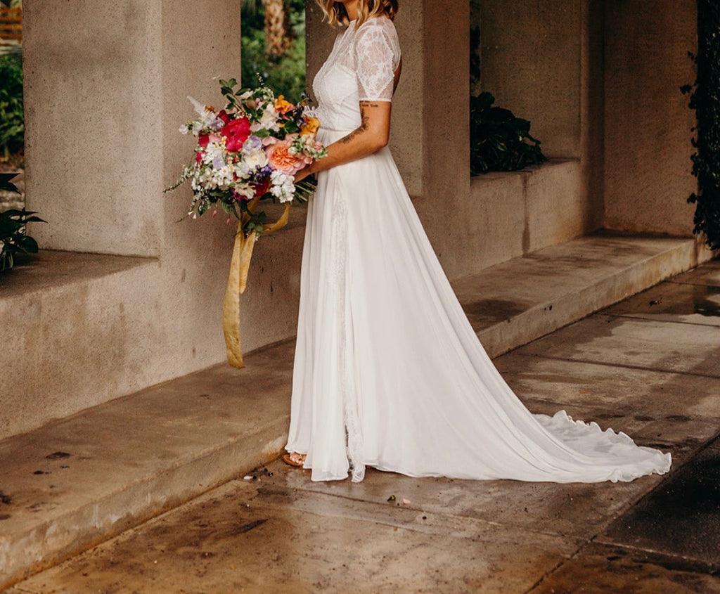 The Valentina, a favourite of the GLL team, features a flattering shape, beginning with a semi-fitted lace bodice with longer line, t-shirt sleeves and straight edge lining, for a contemporary feel. We love the open back with a double satin button closure and artfully placed lace motifs. The dramatic, full circle skirt has been handmade with 10 metres of Italian silk chiffon and a high side split adorned with French eyelash lace. The Valentina is the only dress in our collection with a skirt of this kind.