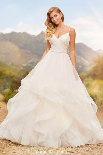 A beaded belt cinches her waist, adding a hint of glamour and accentuating her graceful silhouette. The skirt billows out in a classic ballgown shape, with layer upon layer of tulle creating a sense of whimsy and romance. Each layer is finished with a horsehair edge, lending structure and volume to the skirt while adding a playful bounce to her every step.