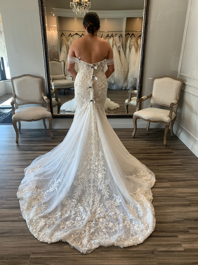 Designer’s details: This sparkling gown with floral details is a glam update to the traditional lace wedding dress. Sculpted bust cups give the bodice and sweetheart neckline a sexy look, while the tulle off-the-shoulder straps bring a sense of romance. The unlined bodice is highlighted with a sense of negative space and adorned with florals that play with scale. The back of the gown’s bodice is completely sheer, showcasing the exposed boning. Just below the hips, the gown’s luminous tulle skirt is embellished with lace appliques and a subtle shimmer and extends out down the dramatic train. The back zips up beneath crystal buttons for the perfect finishing touch.