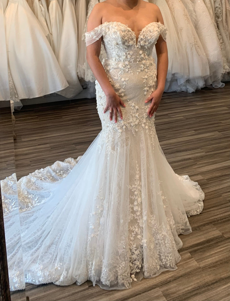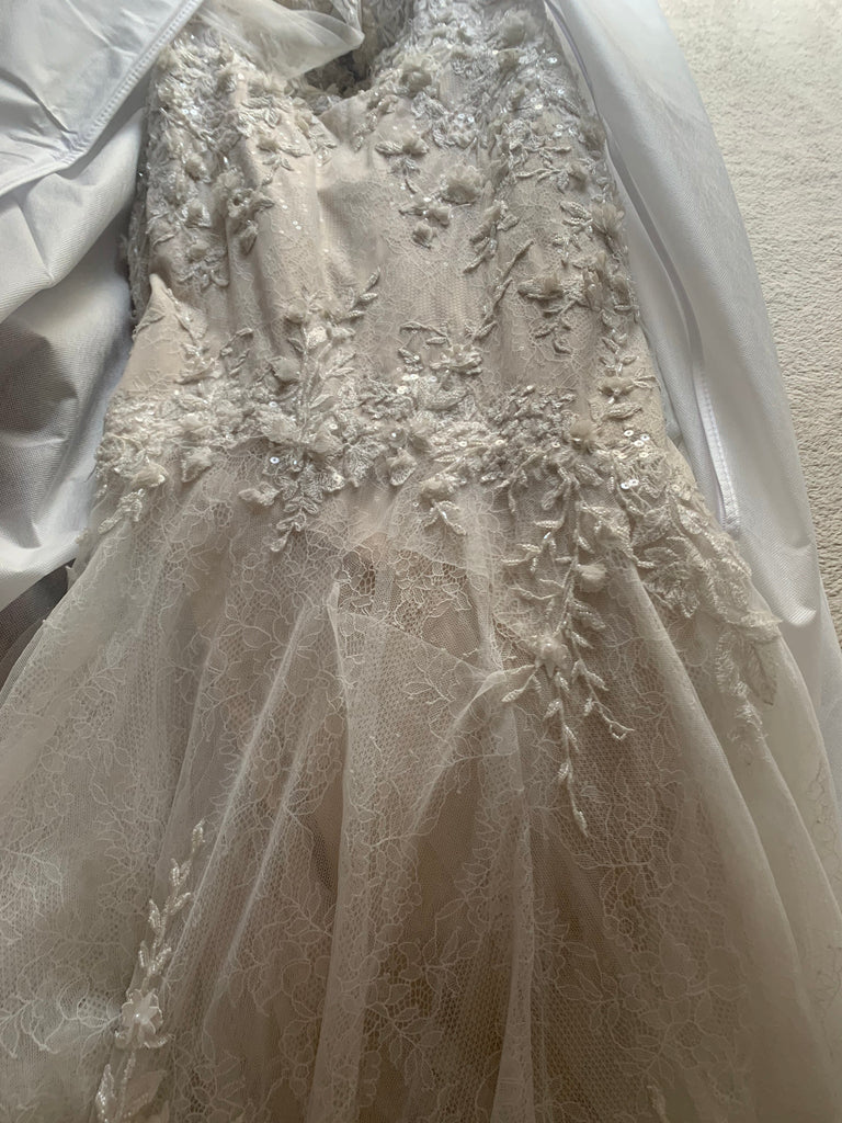 Condition: The dress has 3 tears on it, one on the front and two on the back by the bum area and button area. I was reassured by a seamstress that this dress is 100% repairable unless you’re taller than 5’10 and cannot get the dress hemmed. I am a street size 6 and this size 12 dress. The bridal store informed me that the dress is going to be discontinued soon due to the difficulty in finding this specific fabric and the sample dresses are close to being the last ones out there.