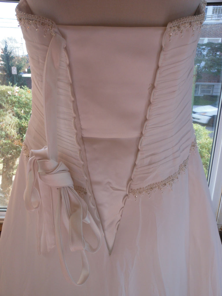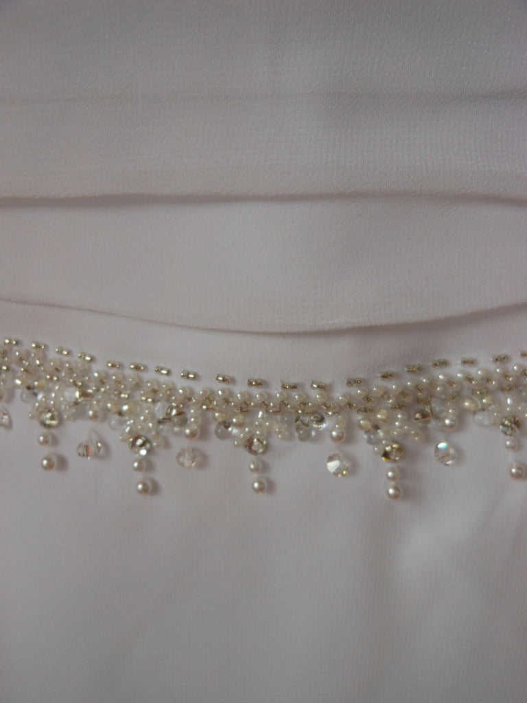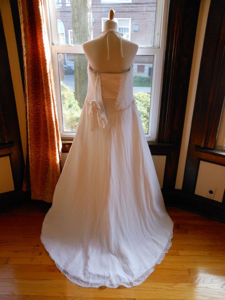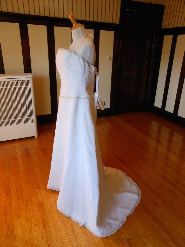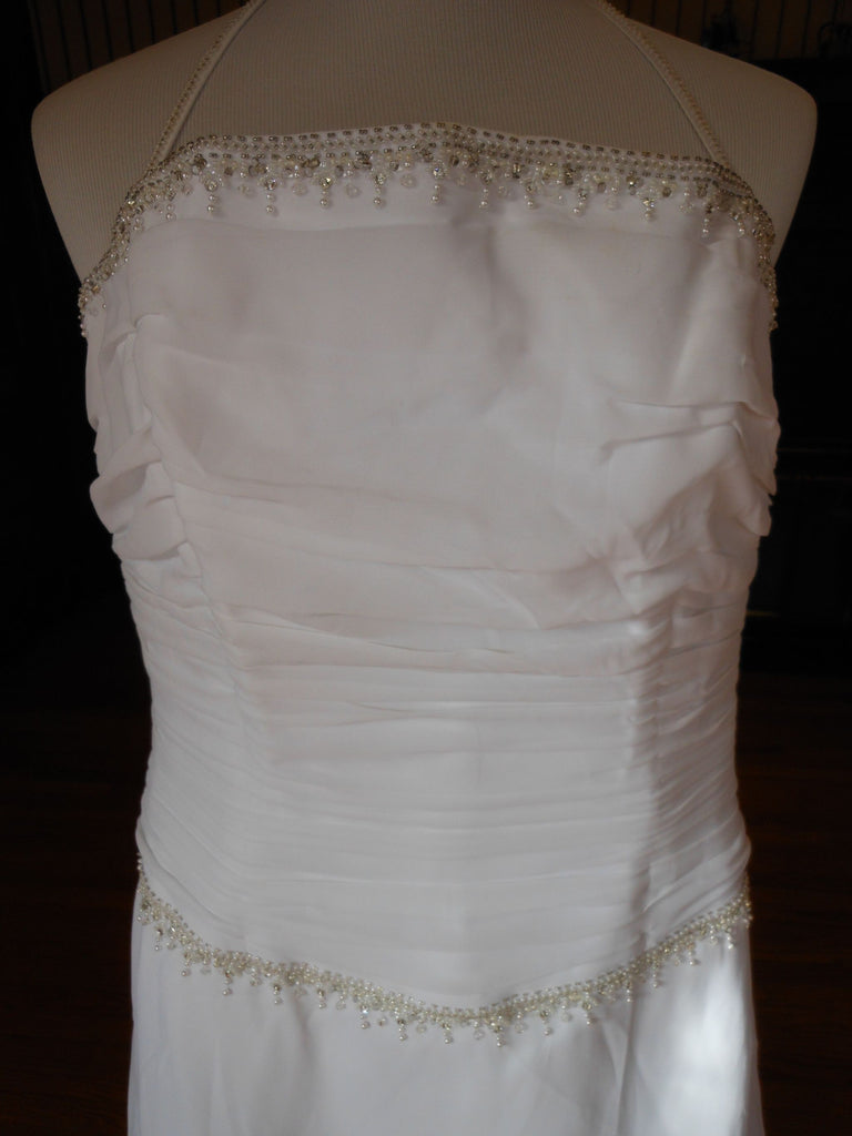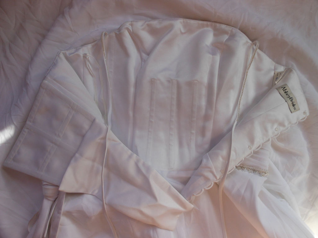 This is an Authentic ABBEY BRIDES Bridal Wedding Dress Gown. The style number of the dress is 50C080. It has a gorgeous A line style with a fabulous chapel train. The gown is made of high grade chiffon and embellished with stunning crystals and exquisite sparkling beads on the neckline, waistline and spaghetti straps. The bodice also has boning to build a perfect shape. This dress is brand new in great condition with the original label and tags. It was never worn.