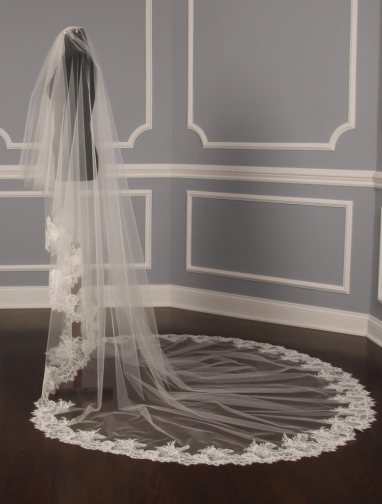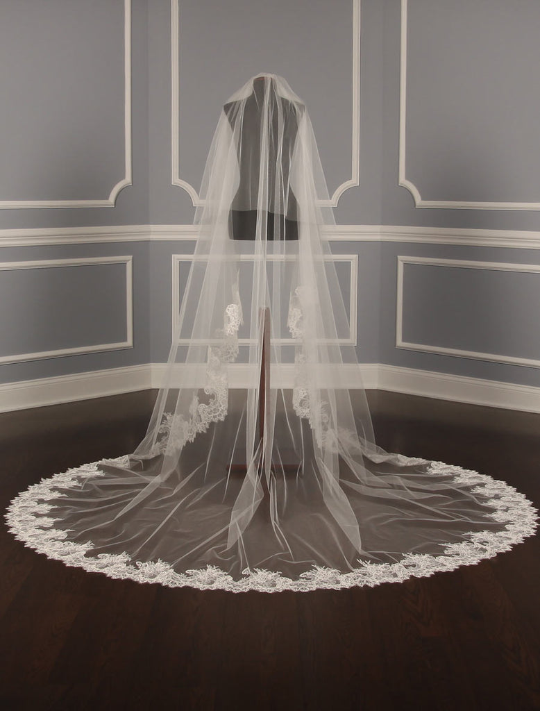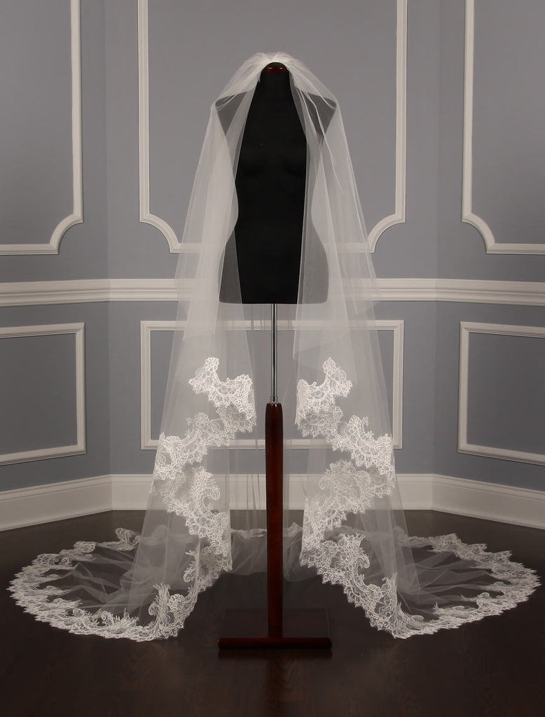 This gorgeous Peter Langner 1452 designer bridal veil is Brand New! The Chantilly Lace edging is absolutely amazing! This is an oval drop style veil. The Chantilly Lace starts approximately 30" down from the top of the veil. The Peter Langner hang tag is attached.