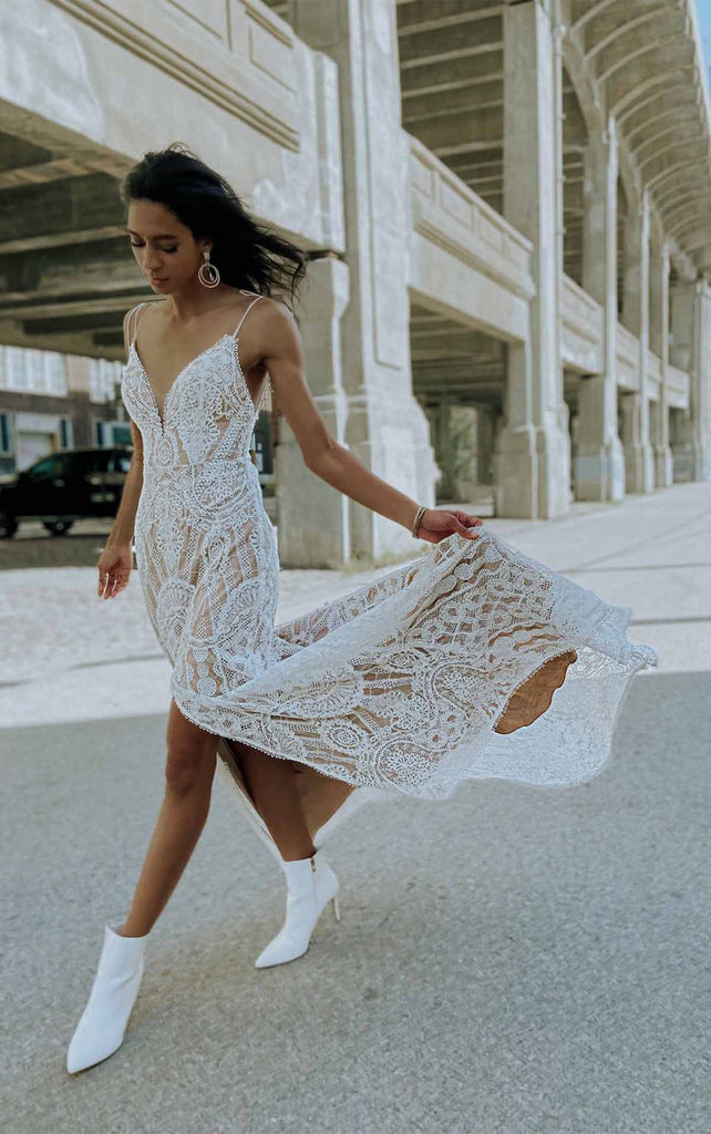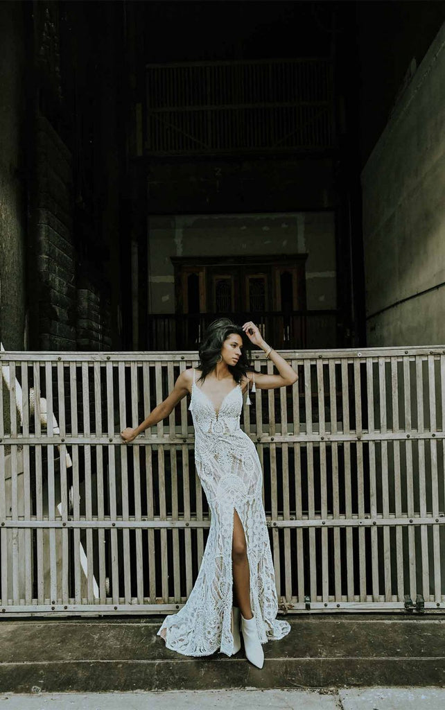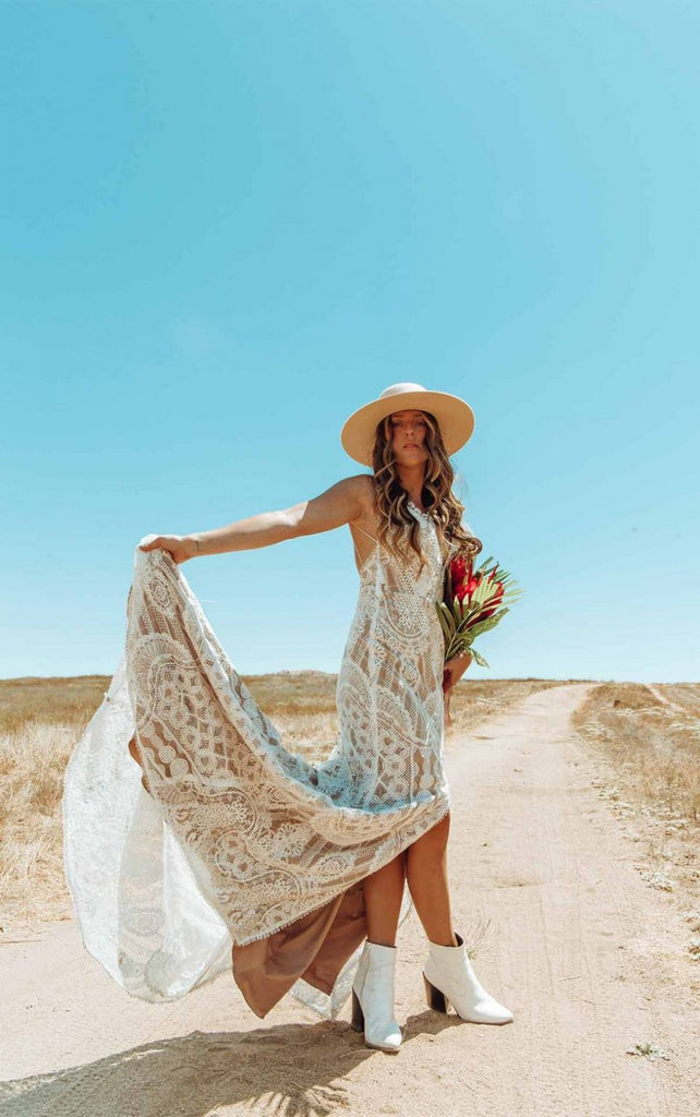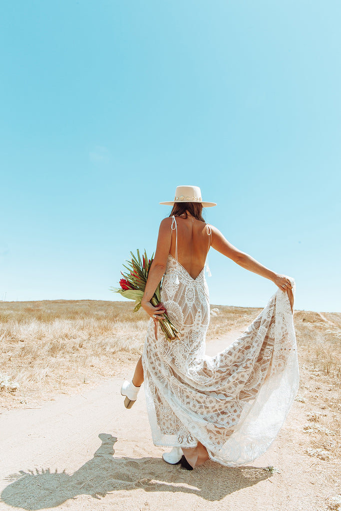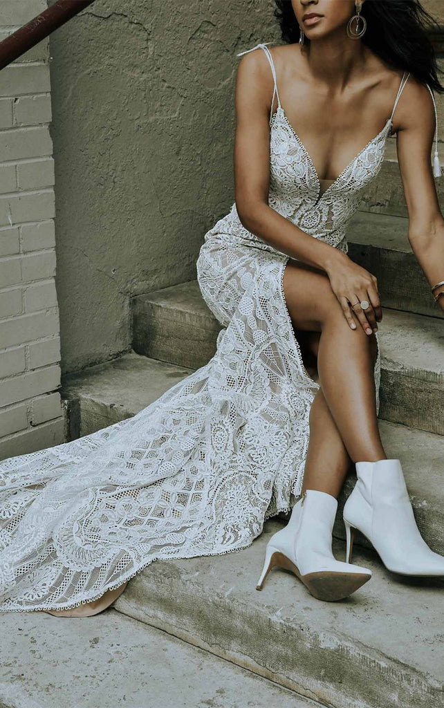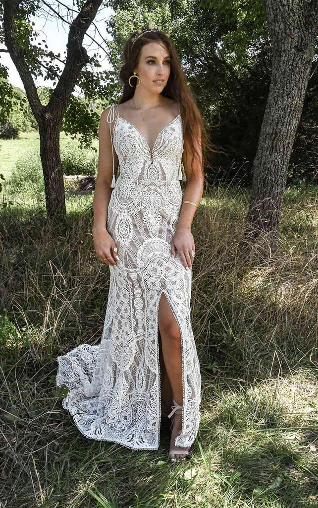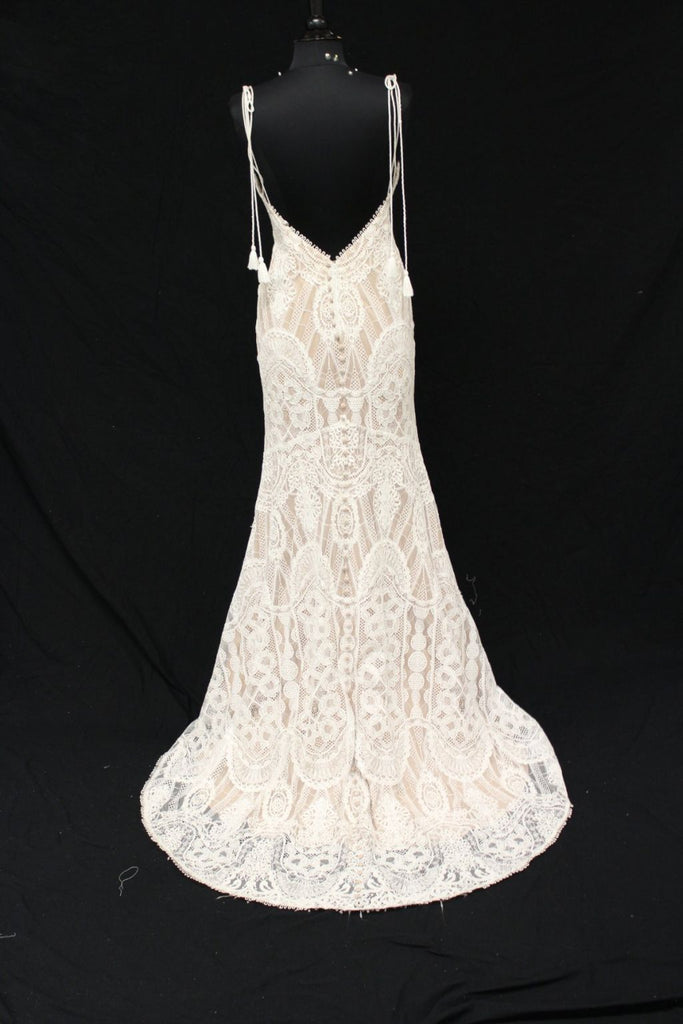 DESCRIPTION: This is a current All Who Wander style. Vintage fringe and Woodstock vibes come together in detailed harmony with All Who Wander’s Arlo wedding dress. The graphic laces of this design are bigger, bolder and better than ever before–complete with heirloom-style patterns and eyelet trims, creating a striking contrast. The braided straps with tassels tie together with bows along the shoulders for an extra dose of charming detail, which fall perfectly about the breathtaking open back. The slit in the front of the skirt makes for ease of movement and a sultry statement within this sheath silhouette, while an easygoing train completes the look with a fresh, lightweight feel.