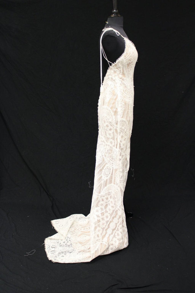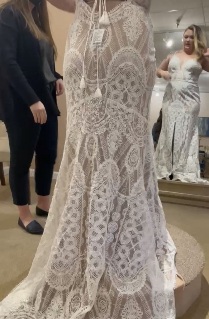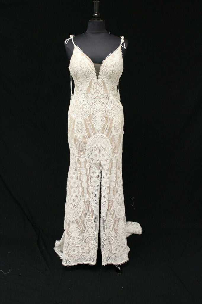 This gown is by bridal designer All Who Wander. The style is called Arlo. It is designed in Lace. The color is Ivory/Hazelnut/Porcelain in a size 10. The original retail price of this gown was $2,500.00