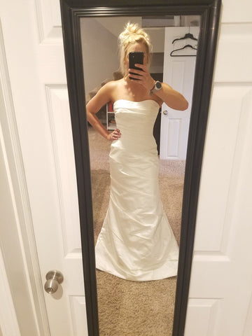 A sleek, strapless, drop-waist satin dress with very slight ruching throughout. Fitted through low-hip and then a slight flare to floor, with a small, built-in petticoat. Hidden zipper back, covered with satin buttons that run down the entire dress to the end of the court-length train. In the pictures, the buttons just aren't closed/looped over zipper since i couldnt reach them behind me. :)