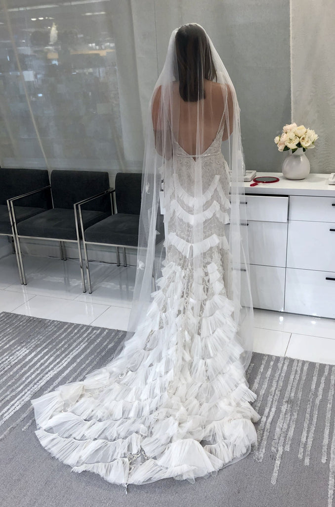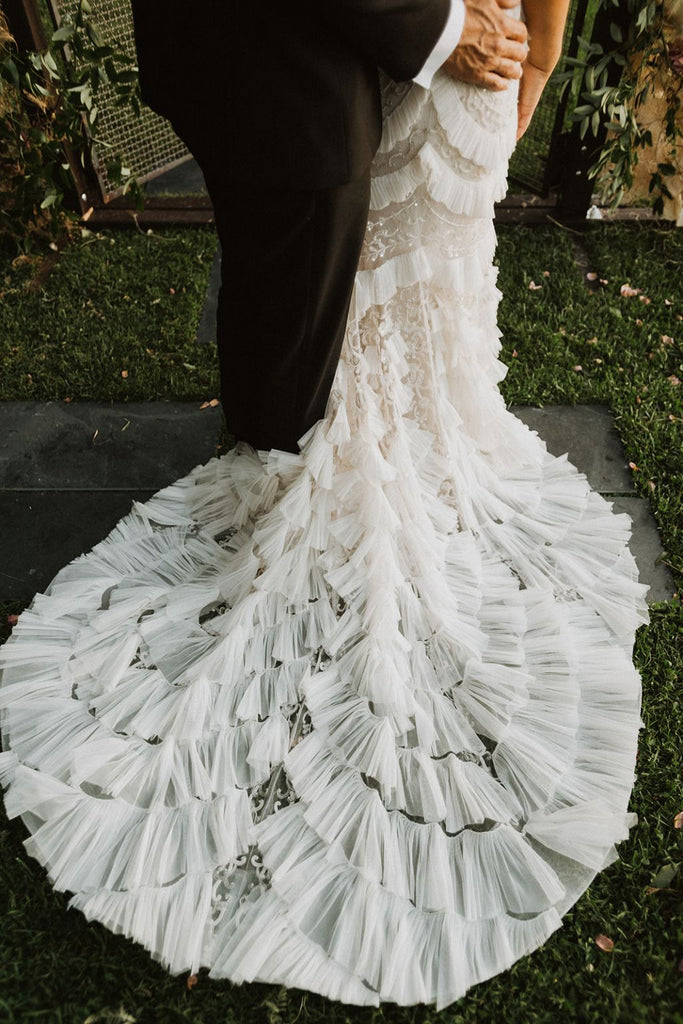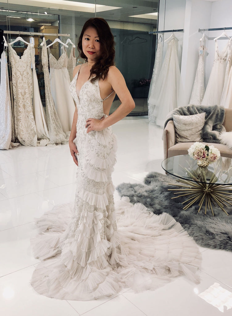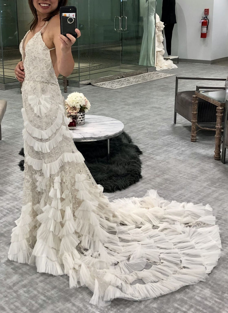 Wait till you see the back! Super chic and sexy low back, simple, minimalist, statement making design. The train is about 2-3 feet long, with just the right balance for drama and practicality. It bustles up real nicely too, creating a sensuous look that compliments the rear. The best thing about this dress is that even with the beading and ruffles like a high end Gatzby flapper dress, it’s super flight weight and easy to move around it.