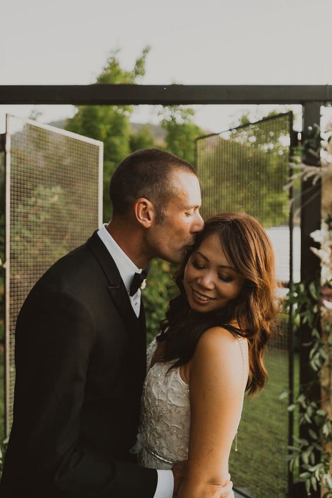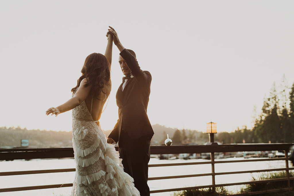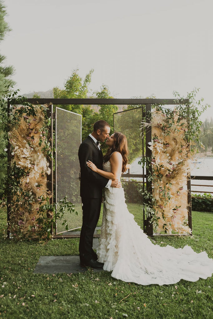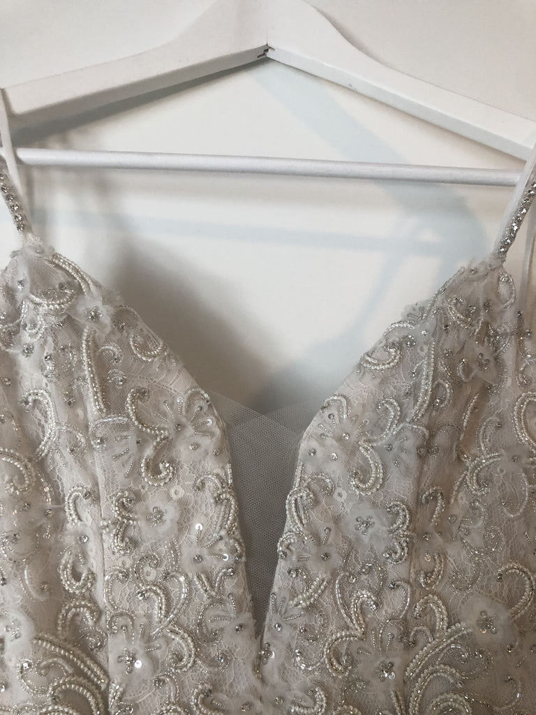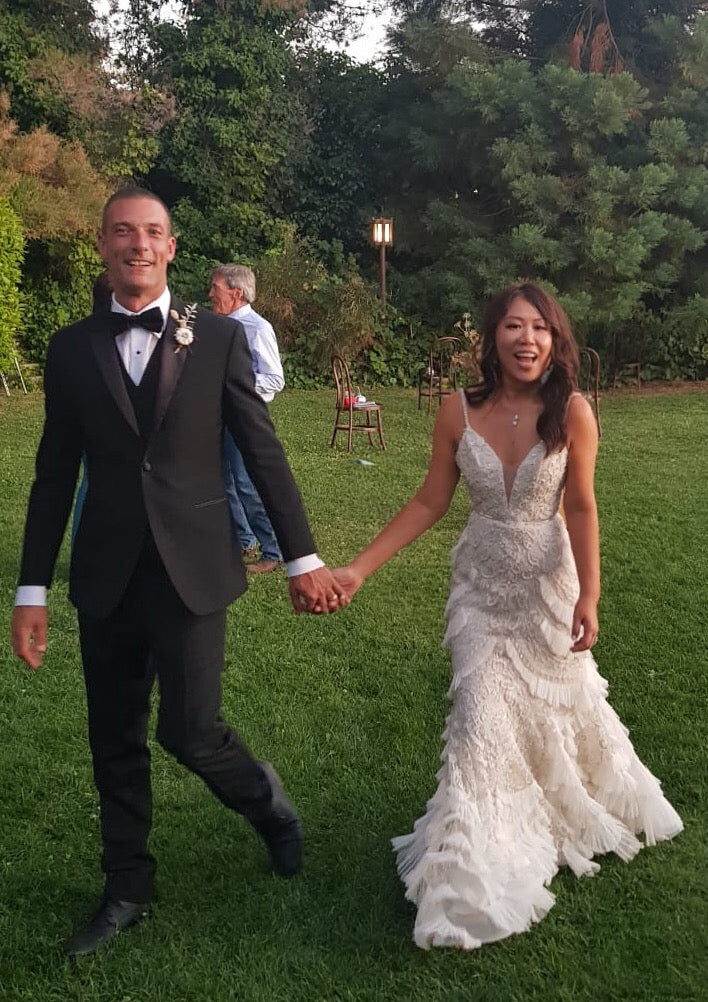 Wait till you see the back! Super chic and sexy low back, simple, minimalist, statement making design. The train is about 2-3 feet long, with just the right balance for drama and practicality. It bustles up real nicely too, creating a sensuous look that compliments the rear. The best thing about this dress is that even with the beading and ruffles like a high end Gatzby flapper dress, it’s super flight weight and easy to move around it.
